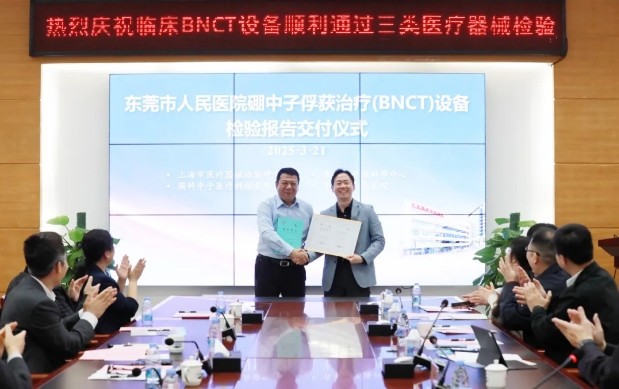 3月21日,硼中子俘獲治療(BNCT)設(shè)備檢驗報告交付儀式在東莞市人民醫(yī)院舉行。這標(biāo)誌著我國首臺具有完全自主知識產(chǎn)權(quán)的臨床BNCT設(shè)備順利通過三類醫(yī)療器械檢驗,為BNCT治..