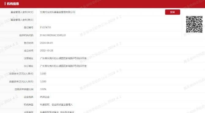 2024年4月1日,東莞生技下屬全資子公司東莞市生技私募基金管理有限公司(簡稱“生技基金公司”)成功通過中國證券投資基金業(yè)協(xié)會審核,獲得私募基金管理人牌照,將依法獨(dú)立開展私募股權(quán)投資、創(chuàng)業(yè)投資等基..